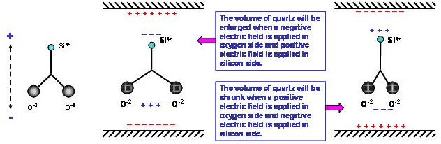 石英材料中的二氧化硅分子(SiO2) 在正常狀態(tài)下, 其電偶極是互相平衡的電中性. 在(如圖)的二氧化硅是以二維空間的簡化圖形. 當(dāng)我們在硅原子上方及氧原子下方分別給予正電場及負(fù)電場時(shí), 空間系統(tǒng)為了維持電位平衡, 兩個(gè)氧原子會相互排斥, 在氧原子下方形成一個(gè)感應(yīng)正電場區(qū)域, 同時(shí)在硅原子上方產(chǎn)生感應(yīng)負(fù)電場區(qū)域. 相反的情況, 當(dāng)我們在硅原子上方及氧原子下方分別給予負(fù)電場及正電場時(shí), 兩個(gè)氧原子會相互靠近, 氧原子下方產(chǎn)生感應(yīng)負(fù)電場,硅原子上方產(chǎn)生感應(yīng)正電場. (如圖). 然而, 氧原子的水平位置變化時(shí), 鄰近的另一個(gè)氧原子會相對的產(chǎn)生排斥或吸引的力量, 迫使氧原子回到原來的空間位置. 因此, 電場的力量與原子之間的力量會相互牽動, 電場的改變與水平方向的形變是形成交互作用狀態(tài). 這個(gè)交互作用會形成一個(gè)在石英材料耗能最小的振動狀態(tài), 祇要由電場持續(xù)給與能量, 石英材料就會與電場之間維持一個(gè)共振的頻率. 這個(gè)壓電效應(yīng)下氧原子的振幅與電場強(qiáng)度及電場對二氧化硅的向量角度有相對應(yīng)的關(guān)系.在實(shí)際的應(yīng)用上, 電場是由鍍在石英芯片上的金屬電極產(chǎn)生, 電場與二氧化硅的向量角度則是由石英晶棒的切割角度來決定.