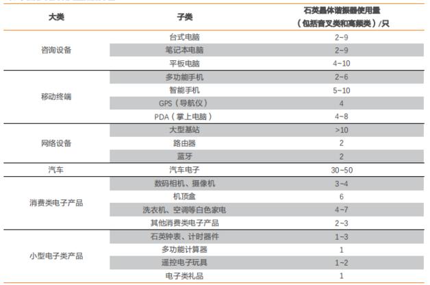 石英晶體諧振器廣泛應(yīng)用于工業(yè)、民用和軍事等電子產(chǎn)品領(lǐng)域,部分應(yīng)用終端對(duì)石英晶體諧振器需求量如下表所列: