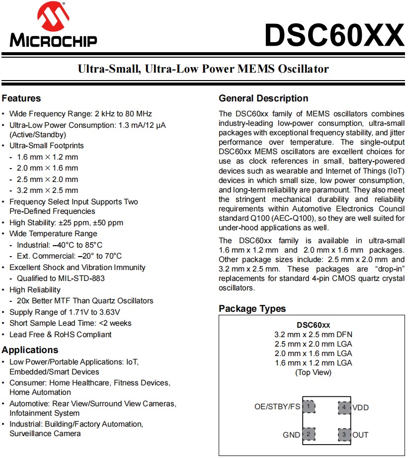 DSC6001CI2A-004.0000 | Microchip晶振 | DSC60XX | 4MHz | 1.71 V ~ 3.63 V |