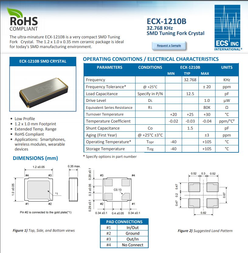 這款貼片晶振的料號為ECX-1210B,從型號可以看出改產品小體積的特性,因為很多晶振廠商的料號都會體驗出一定的產品信號,比如像KDS晶振公司的DX1008JS石英晶振,它的尺寸就是1008mm.ECS推出這款晶振具有1.2mmx1.0mm的4焊盤尺寸,非常適合對尺寸至關重要的可穿戴應用.