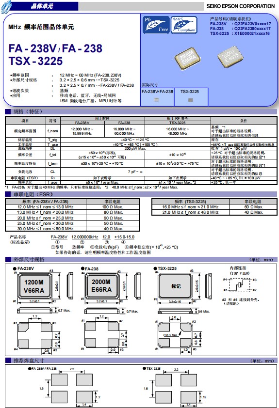 日本進(jìn)口愛普生晶振FA-238V是一款小體積晶振尺寸3.2x2.5mm四腳貼片晶振,無源晶振,石英晶體諧振器,F(xiàn)A-238V頻率范圍12MHz至15.9999MHz之間,可以在-40℃至+85℃(+105℃)溫度內(nèi)穩(wěn)定工作,該產(chǎn)品具有小體積輕薄型,耐熱、耐振、耐沖擊等優(yōu)良的耐環(huán)境特性,被廣泛用于移動(dòng)通訊,智能手機(jī),平板電腦,汽車電子,移動(dòng)電話,無線藍(lán)牙,ISM頻段電臺(tái)廣播,MPU時(shí)鐘等.