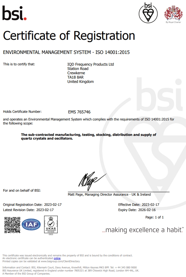 最初于1988年獲得BS 5750認(rèn)證,IQD所有的設(shè)計(jì)、制造和測試設(shè)施都通過了ISO 9001:2015認(rèn)證。我們的質(zhì)量管理體系不斷改進(jìn)和調(diào)整,以滿足國際標(biāo)準(zhǔn)和客戶的要求。 質(zhì)量是IQD晶振成功的基石,我們?yōu)槲覀兊囊幌盗蓄l率控制產(chǎn)品提供全面的質(zhì)量解決方案。我們的質(zhì)量管理體系確立了適當(dāng)?shù)睦砟?,以確保公司及其員工遵守文件規(guī)定的程序,并通過提供高度誠信的產(chǎn)品和服務(wù)來保持客戶滿意度。