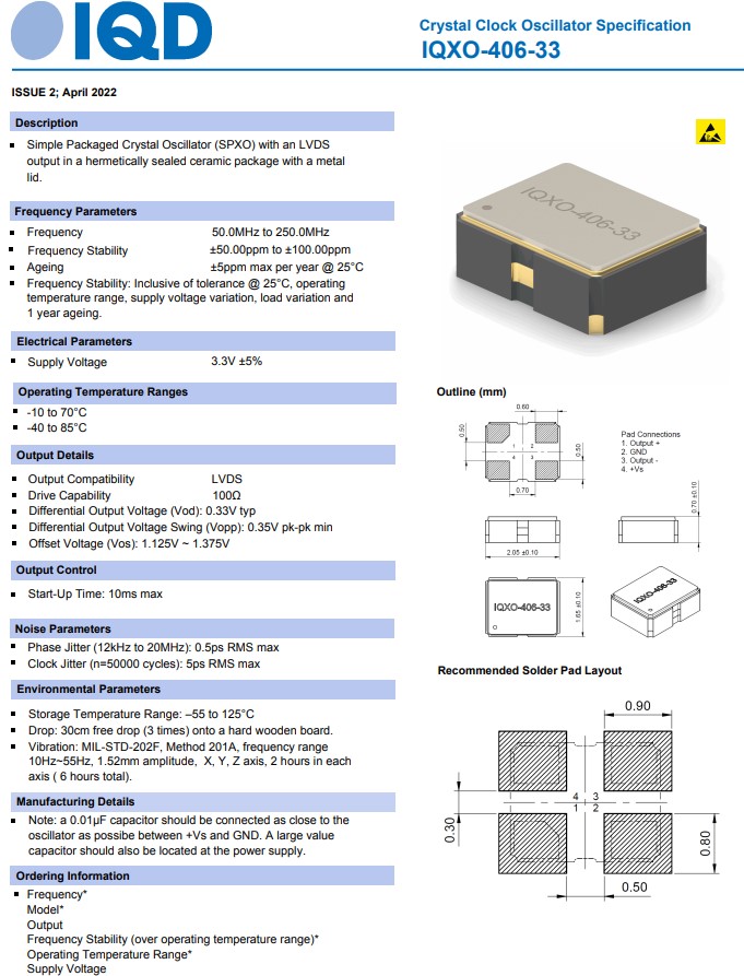 IQD晶振公司推出其最新的LVDS / LVPECL時(shí)鐘振蕩器IQXO-406,采用超微型2.0x1.6mm封裝,四腳貼片晶振,有源晶振,石英晶振,晶體振蕩器。新型時(shí)鐘振蕩器的頻率范圍從50MHz到250MHz,在一個(gè)完整的器件中提供小型化和高速運(yùn)行。與CMOS邏輯信號(hào)相比,LVPECL和LVDS輸出提供“互補(bǔ)對(duì)”邏輯,有助于在更高頻率下降低噪聲。帶LVDS的簡單封裝晶體振蕩器(SPXO) 輸出采用金屬密封陶瓷封裝蓋子。差分晶振具有超小型,輕薄型,耐熱及耐環(huán)境特點(diǎn),常見的應(yīng)用包括5G、以太網(wǎng)(10G/100G/1000G)、光纖通道、物聯(lián)網(wǎng)、SONET/SDH和可穿戴設(shè)備。超小型LVDS晶振IQXO-406-33用于光纖通道設(shè)備
