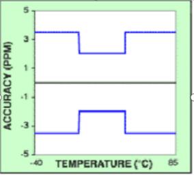 理想的精確計時器件是集成了RTC、TCXO和石英晶體的單芯片方案。DS3231S、 DS3232和即將公布的DS3234既是這樣的器件。這些器件具有無與倫比的精度:0°C到+40°C范圍內(nèi)精度為±2.0ppm,相當于每年±1.0分鐘;-40°C到0°C和+40°C到+85°C范圍內(nèi)為±3.5ppm,相當于每年±1.8分鐘。最差情況下所能提供的精度如圖所示。如上所述,集成TCXO使晶體原有的拋物線特性曲線變成較為平坦的曲線 與上述TCXO方案相同,完全集成的器件經(jīng)過工廠校準,不需要用戶校準,也不需要額外的開發(fā)投入。它將同樣的功能集成在更小的面積上,同時也降低了系統(tǒng)成本。