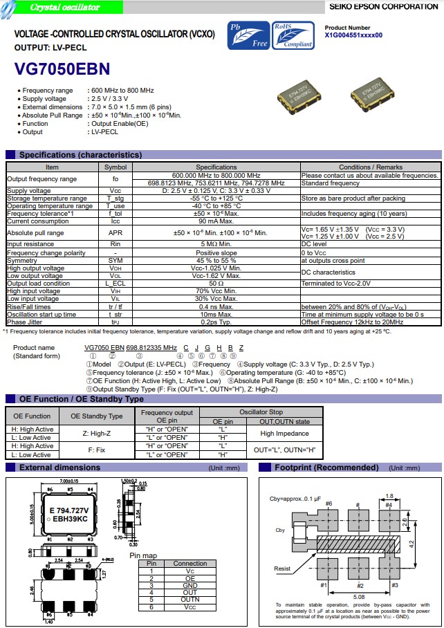 X1G004551000300 | VG7050EBN | 698.812335MHz | 7.00x5.00x1.50mm | LV-PECL | 2.970 to 3.630 V |