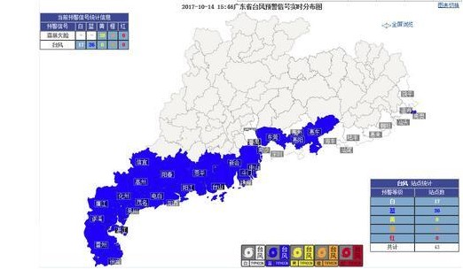 截至15:46時(shí),廣東全省共有26個(gè)市縣發(fā)布臺風(fēng)藍(lán)色預(yù)警信號.