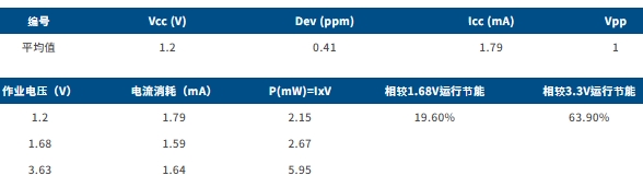 以下測試結(jié)果展示了1.2V TCXO的卓越功耗效率。 與1.68V和3.3V運(yùn)行相比,1.2V在兩種封裝上都實現(xiàn)了顯著的節(jié)能效果。