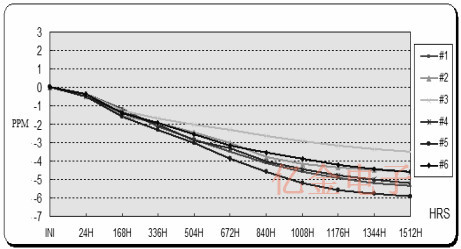 最大驅(qū)動器級別規(guī)格為100μW.頻率規(guī)格在25±3℃時<7ppm,在-20至70℃下<10ppm,和<3ppm第一年老化.石英晶體去了通過常規(guī)可靠性資格包括加速老化試驗(在100μW耗散下)通過老化和石英的高溫儲存諧振器的壽命評估,在85oC下進行1000小時石英晶體減少了在測試結束時超過1ppm.兩套(六套設備每個)相同的石英晶體經(jīng)歷了相同的在650μW和950μW耗散下進行加速老化測試分別使用7400IC,C1=C2=15pF.該第一組在85℃下老化至1000小時(圖6).第二組在85oC下老化至1500小時(圖7). 1000小時后,第二盤以3比5落敗1000小時后達到ppm,1500時達到3.5至6ppm小時.第二集也開始顯示出來的跡象穩(wěn)定在~1100小時.沒有顯著增加觀察到所有12個石英晶體的Rm.作為晶振晶體的總頻率為17ppm允許在25oC加上溫度范圍操作和振蕩器預計不會運行持續(xù)在85oC,客戶可能應該這樣做他們的振蕩器從頻率上沒有問題從Rm比的漂移和負阻力來看即使他們駕駛這種特殊的石英晶體方式超過規(guī)范.