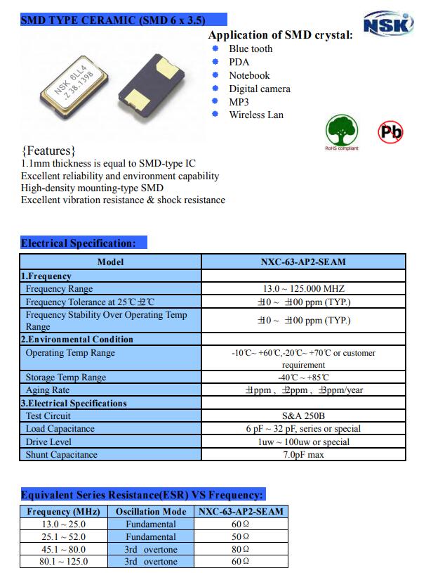 更多>>NSK津綻晶振,NXC-63-AP2-SEAM晶振,6035二腳晶振